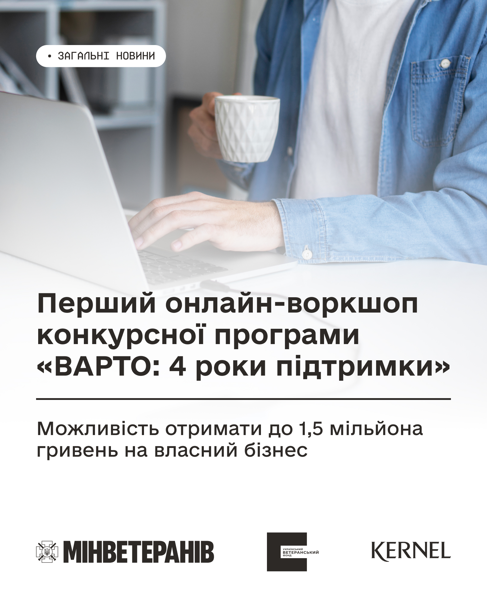 Конкурс «ВАРТО: 4 роки підтримки» Українського ветеранського фонду Мінветеранів — це можливість для ветеранів та ветеранок отримати від 500 тисяч до 1,5 мільйона гривень і реалізувати власну бізнес-ідею або дати новий поштовх уже створеному бізнесу. Реалізується Українським ветеранським фондом Мінветеранів у партнерстві з компанією Kernel.