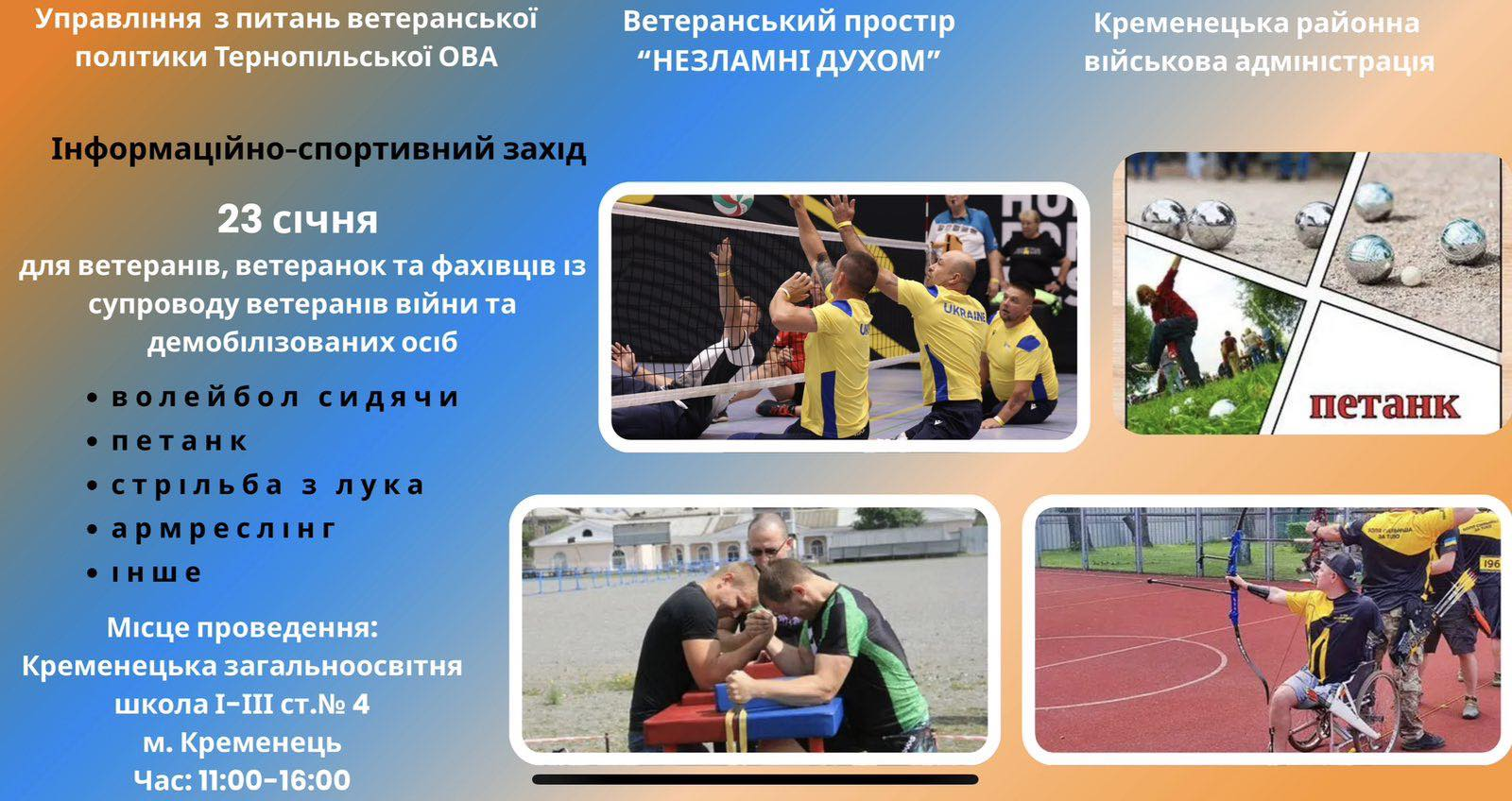 міської ради та Кременецької районної військової адміністрації відбудеться спортивний захід з адаптивних видів спорту для ветеранів, ветеранок та осіб з інвалідністю внаслідок війни.