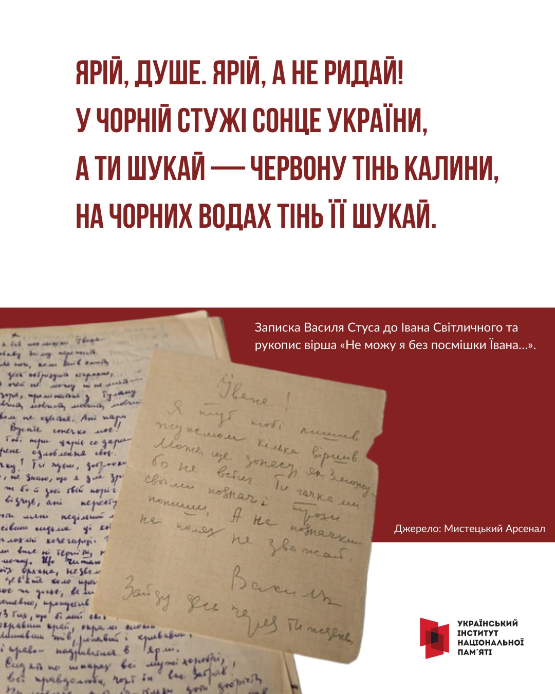 Із 47-ми років життя 13 він провів у радянських слідчих ізоляторах, карцерах, камерах-одиночках, мордовських таборах, на Колимі, на каторжній роботі в шахті. Його намагалися зламати: позбавляли побачень з рідними, вилучали вірші, листи й рукописи, знущалися фізично й знищували морально. Але навіть за гратами Стус лишався вільною людиною. Уже будучи в таборі, він приєднався до Української Гельсинської групи, розуміючи, що підписує собі смертний вирок.