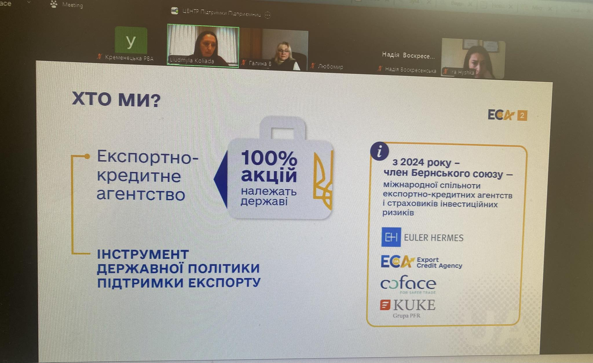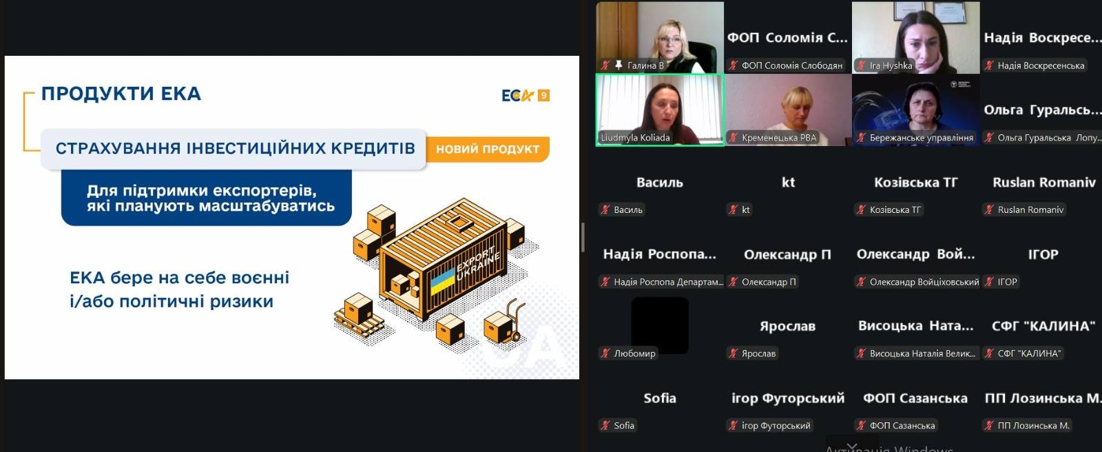 Спікером зустрічі виступила Людмила Коляда, заступник начальника управління продажів Експортно-кредитного агентства України, яка детально розповіла про механізми державної підтримки експортерів, можливості страхування ризиків у зовнішньоекономічній діяльності та роль агентства у стимулюванні українського експорту.
