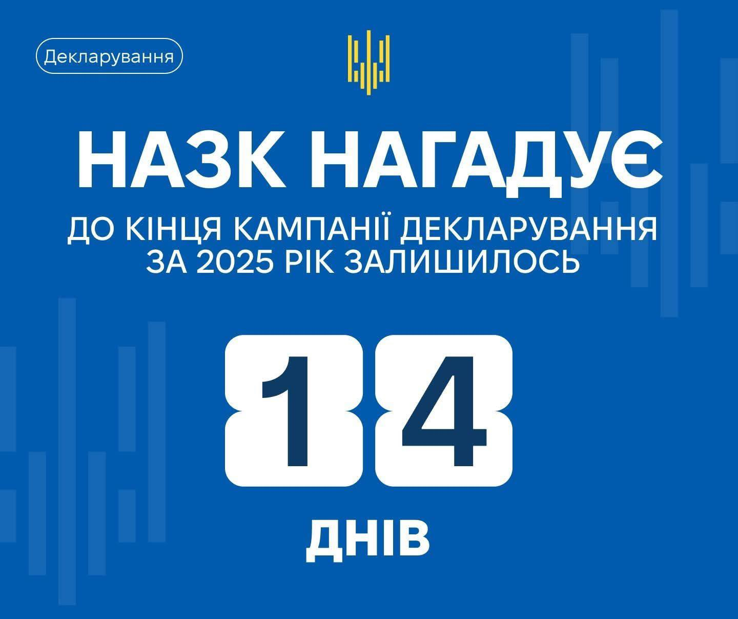 Національне агентство з питань запобігання корупції - НАЗК нагадує, щорічна декларація за 2025 рік має бути подана до 31 березня включно. В останні дні навантаження на систему суттєво зростає, тому радимо подати декларацію завчасно.