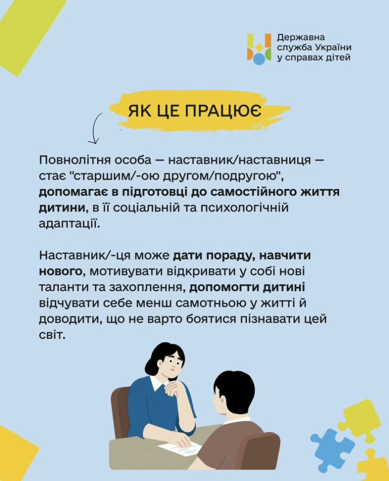 Особливо важливим наставництво є для дітей, які потребують додаткової уваги та підтримки дорослого. Такий формат взаємодії не передбачає матеріальної допомоги, а ґрунтується на довірі, регулярному спілкуванні та щирій зацікавленості в розвитку дитини.
