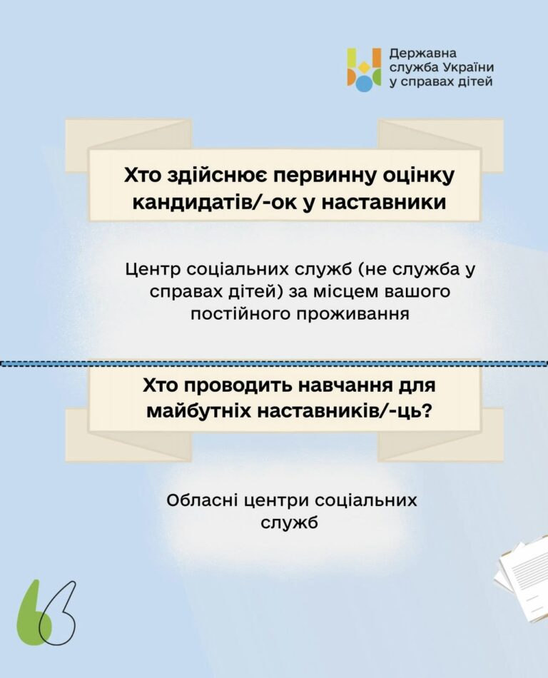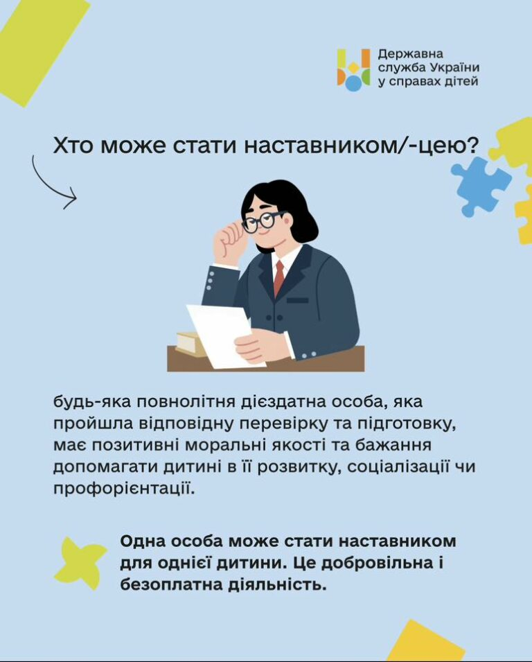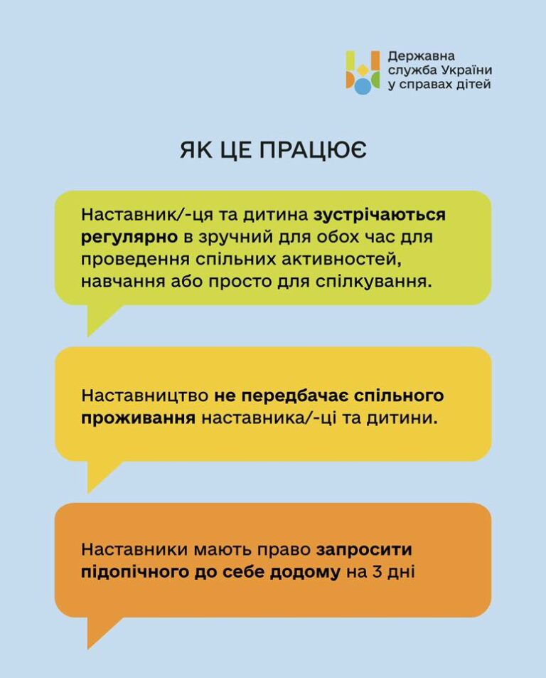 Якщо ви готові стати наставником або бажаєте дізнатися більше про умови участі у програмі, ознайомитися з процедурою оформлення та вимогами, детальна інформація розміщена на офіційному вебпорталі служби у справах дітей: https://children.gov.ua/