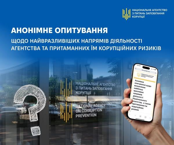 Мета анкетування — отримати об’єктивну та неупереджену думку суспільства щодо найбільш вразливих напрямів діяльності Агентства, а також притаманних їм корупційних ризиків.
