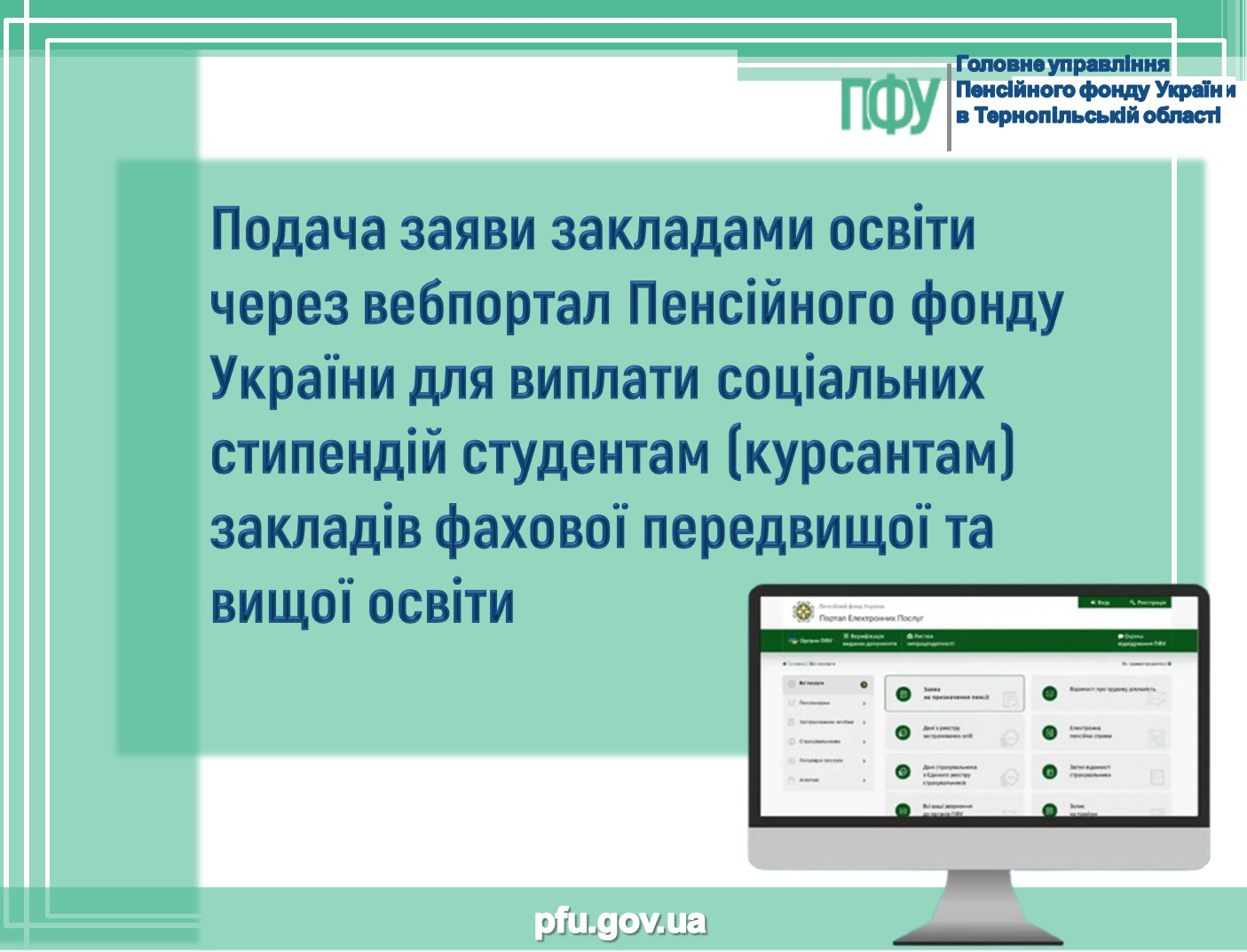Пенсійним фондом України реалізовано можливість подання через особистий кабінет страхувальника вебпорталу електронних послуг Пенсійного фонду України (https://portal.pfu.gov.ua/) нового типу звернення для прийняття щомісячних заяв від закладів освіти зі списком студентів (курсантів), яким призначено соціальну стипендію на поточний місяць.