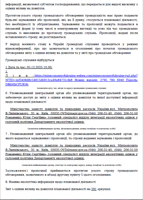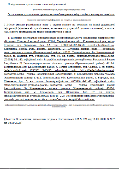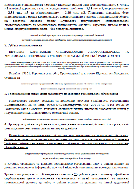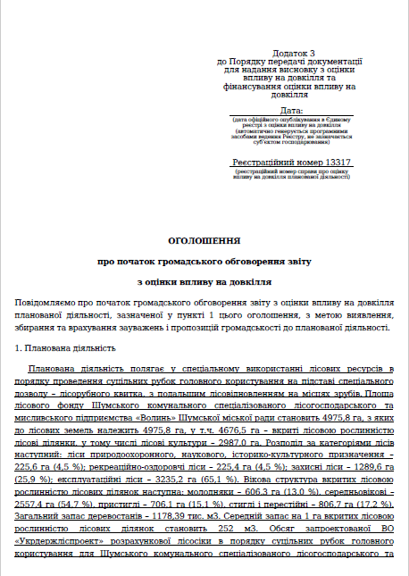 Міністерство економіки, довкілля та сільського господарства України повідомляє, що відповідно до вимог Закону України «Про оцінку впливу на довкілля» (далі – Закон) 17.11.2025 ШУМСЬКИМ КОМУНАЛЬНИМ СПЕЦІАЛІЗОВАНИМ ЛІСОГОСПОДАРСЬКИМ ТА МИСЛИВСЬКИМ ПІДПРИЄМСТВОМ «ВОЛИНЬ» ШУМСЬКОЇ МІСЬКОЇ РАДИ завантажено до Єдиного реєстру з оцінки впливу на довкілля оголошення про початок громадського обговорення звіту з оцінки впливу на довкілля (далі – Оголошення) та звіт з оцінки впливу на довкілля стосовно планованої діяльності «Спеціальне використання лісових ресурсів в порядку проведення рубок головного користування та рубок формування та оздоровлення лісів на території Шумського комунального спеціалізованого лісогосподарського та мисливського підприємства «Волинь» Шумської міської ради» (реєстраційний номер справи – 13317).