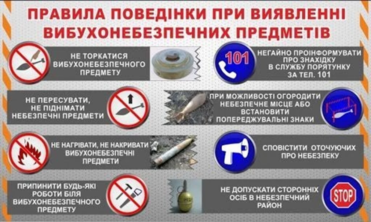 підходити близько до будь-яких підозрілих предметів, схожих на боєприпаси, ракети, уламки БпЛА чи військове обладнання;
