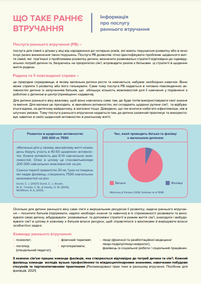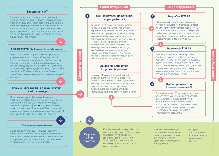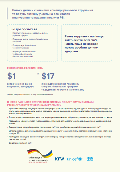 Послуга раннього втручання - це послуга для сімей з дітьми у віці від народження до чотирьох років, які мають порушення розвитку або в яких існує ризик виникнення таких порушень. Послуга раннього втручання дозволяє чітко ідентифікувати проблеми щоденного життя сімей, які пов’язані з проблемами розвитку дитини, визначити розвивальні стратегії відповідно до індивідуальних потреб дитини та, базуючись на пріоритетах сім’ї, впровадити разом з батьками ці стратегії в щоденне життя родини.