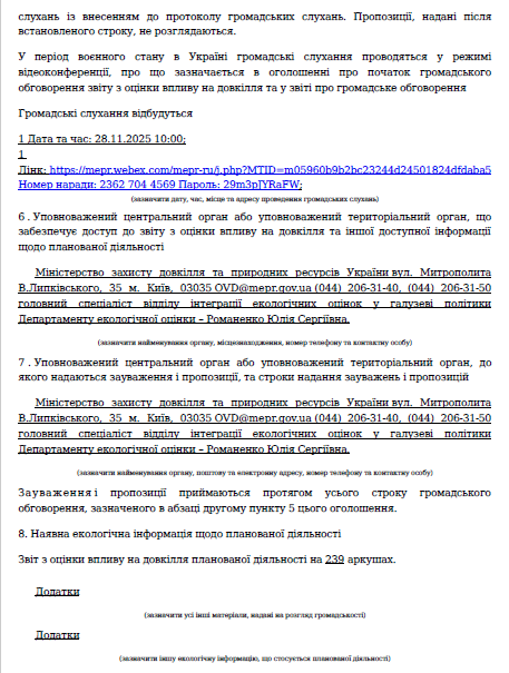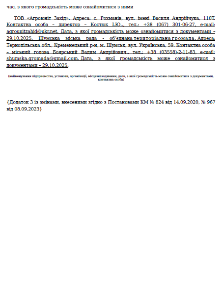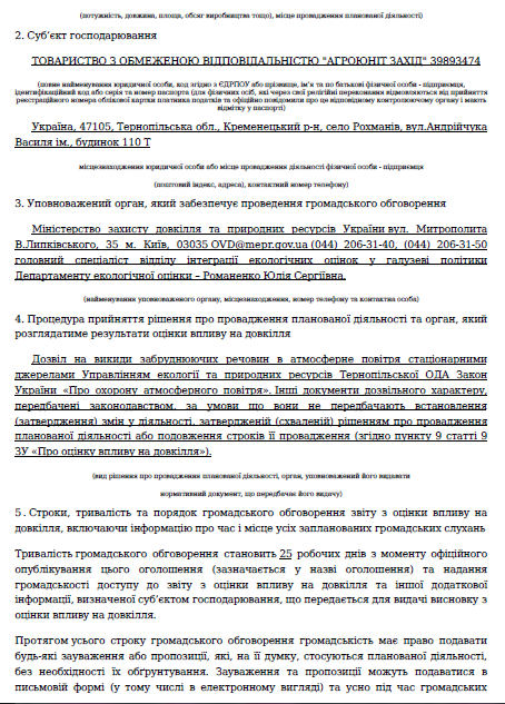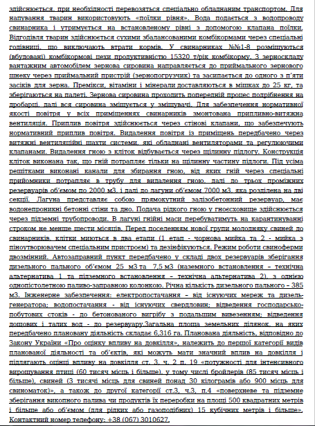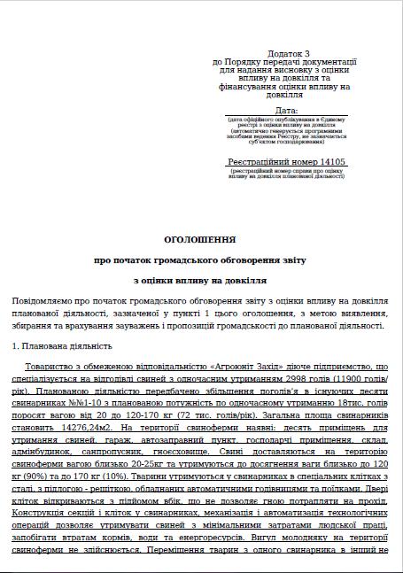 Відповідно до вимог Закону України «Про оцінку впливу на довкілля» (далі – Закон) 30.10.2025 ТОВ «АГРОЮНІТ ЗАХІД» завантажено до Єдиного реєстру з оцінки впливу на довкілля оголошення про початок громадського обговорення звіту з оцінки впливу на довкілля (далі – Оголошення) та звіт з оцінки впливу на довкілля стосовно планованої діяльності «Збільшення поголів’я в існуючих десяти свинарниках №№ 1-10 з планованою потужність по одночасному утриманню 18 тис. голів поросят вагою від 20 до 120-170 кг (72 тис. голів/рік)» (реєстраційний номер справи – 14105).