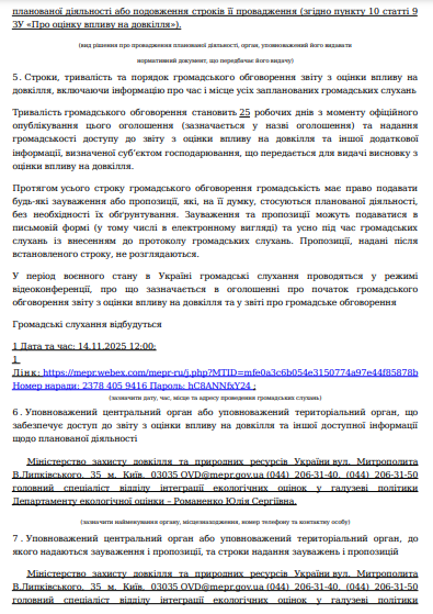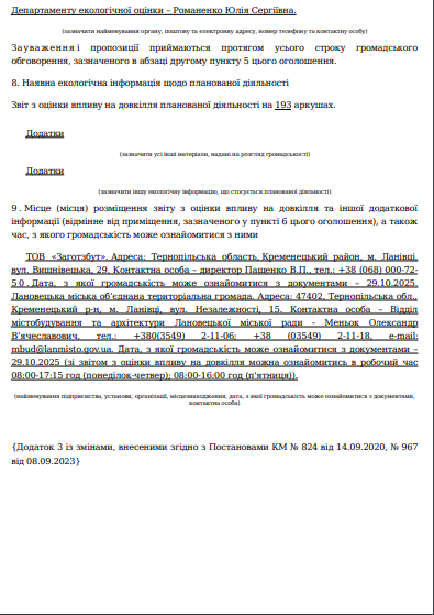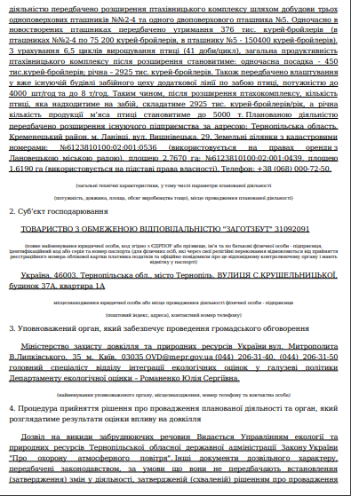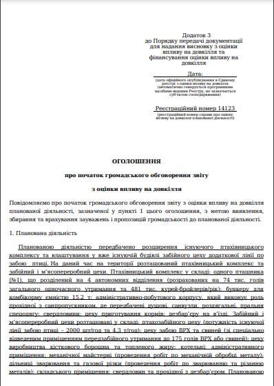 Відповідно до вимог Закону України «Про оцінку впливу на довкілля» (далі – Закон) 30.10.2025 ТОВ «ЗАГОТЗБУТ» завантажено до Єдиного реєстру з оцінки впливу на довкілля оголошення про початок громадського обговорення звіту з оцінки впливу на довкілля (далі – Оголошення) та звіт з оцінки впливу на довкілля стосовно планованої діяльності «Розширення існуючого птахівницького комплексу та влаштування у вже існуючій будівлі забійного цеху додаткової лінії по забою птиці» (реєстраційний номер справи – 14123).