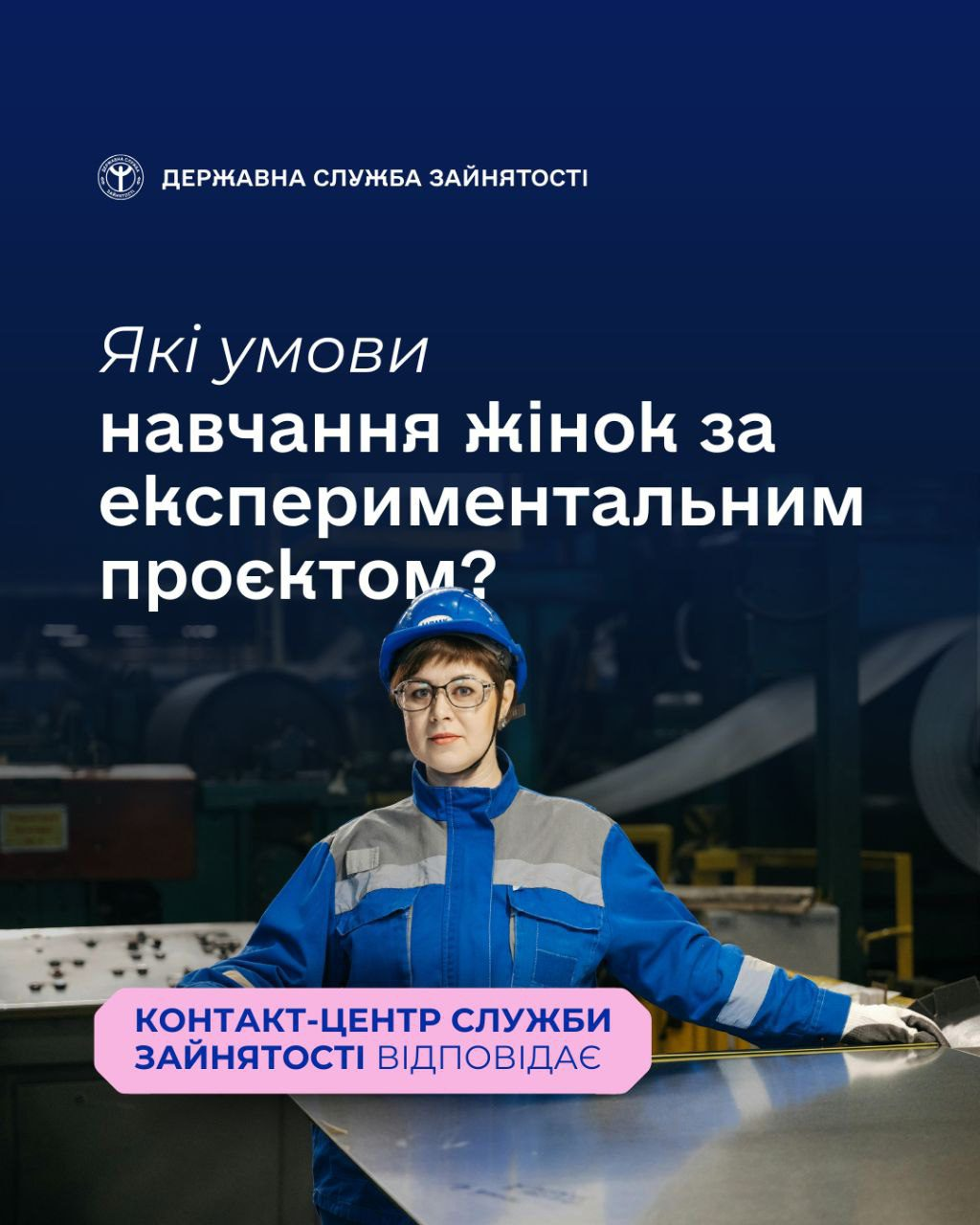Служба зайнятості реалізує урядовий експериментальний проєкт, який дає можливість жінкам безоплатно здобути професії, що традиційно вважалися «чоловічими». Завдяки рішенню Уряду навчання фінансується Фондом загальнообов'язкового державного соціального страхування України на випадок безробіття, а роботодавці надають місця для проходження практики та працевлаштовують жінок після завершення навчання.