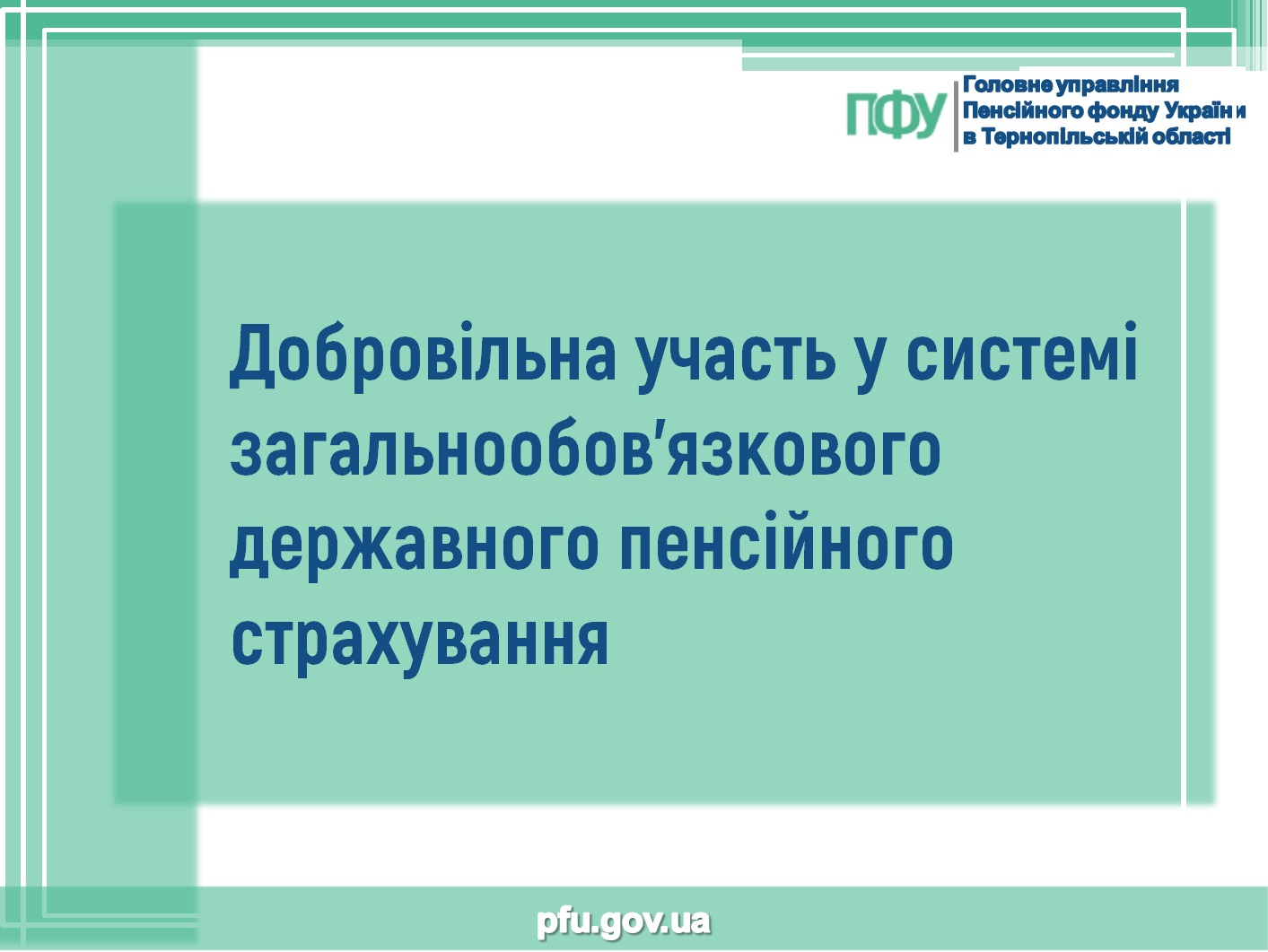 Добровільна участь у системі загальнообов’язкового державного пенсійного страхування регулюється Законом України від 08 липня 2010 року №2464-VI “Про збір та облік єдиного внеску на загальнообов’язкове державне соціальне страхування” та надає можливість забезпечити страховий стаж і створити умови для збільшення розміру майбутньої пенсії.