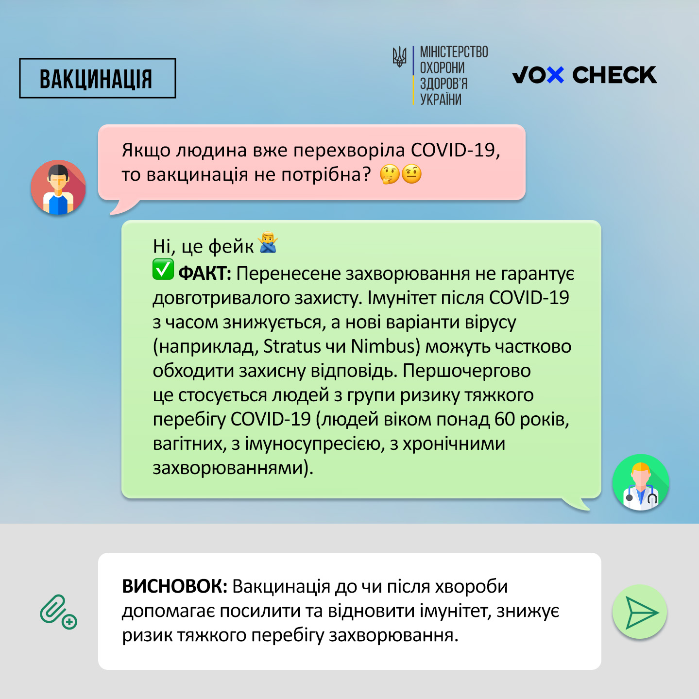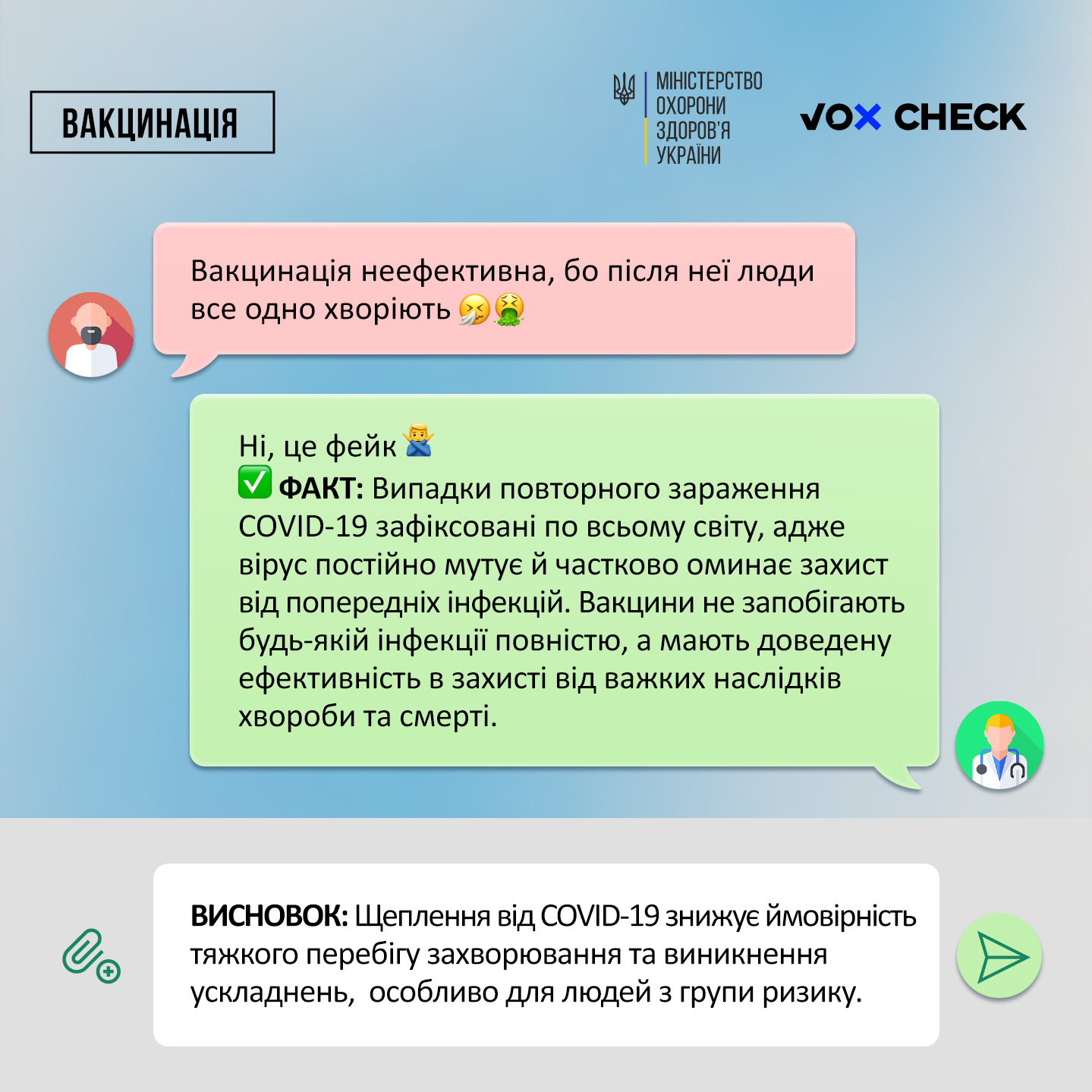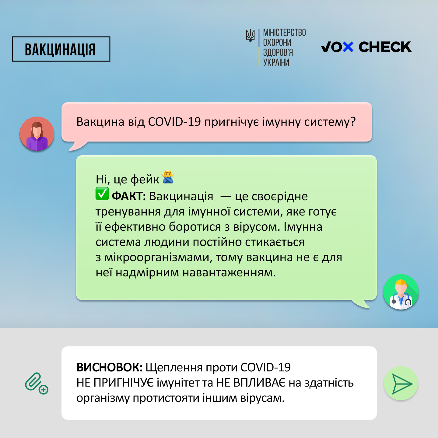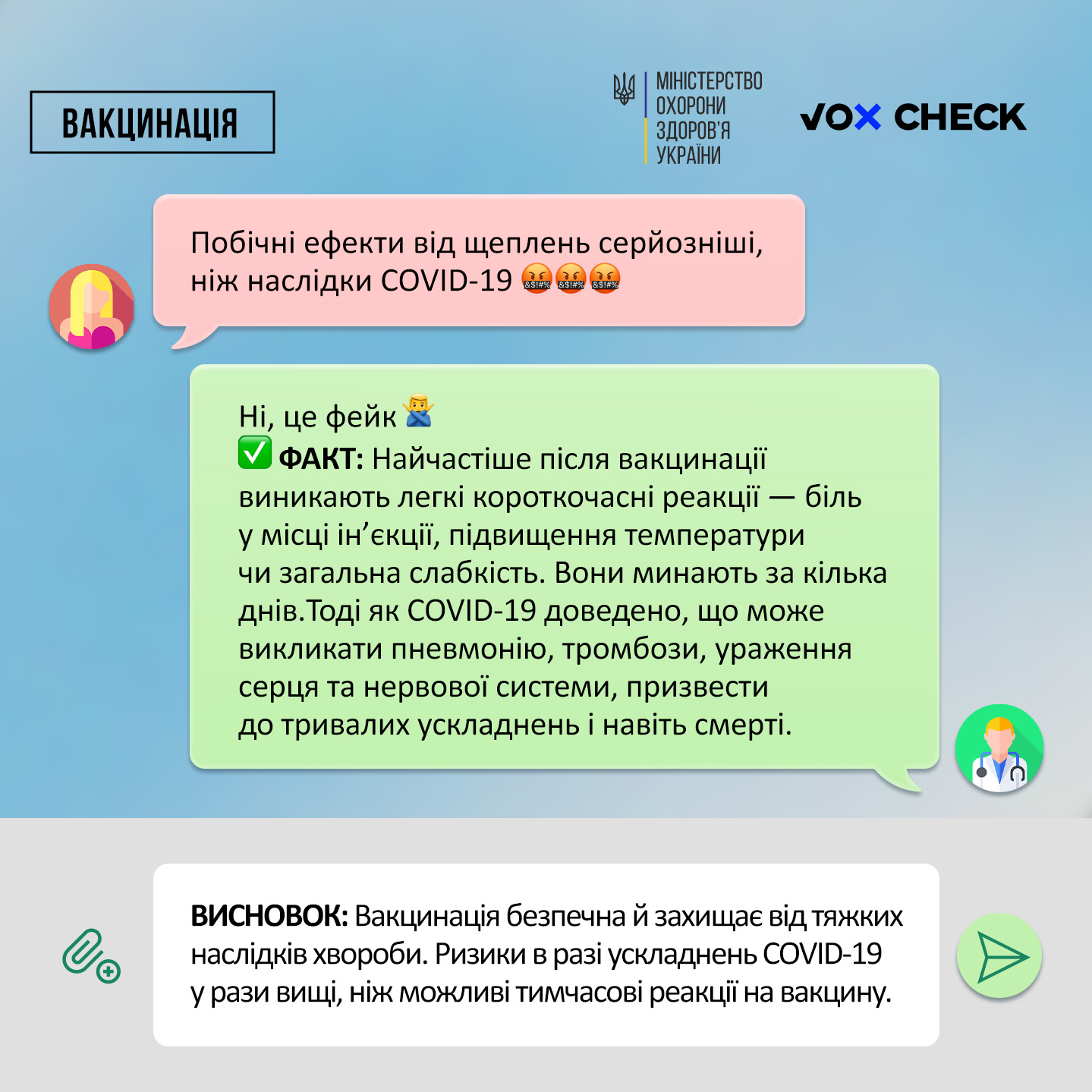 Правдиві дані — це ваш захист. Разом з командою фактчекерів VoxCheck зібрали та спростували найпоширеніші фейки, які з'явилися у соціальних мережах довкола вакцинації від COVID-19. Зберігайте та поширюйте лише правдиві факти.